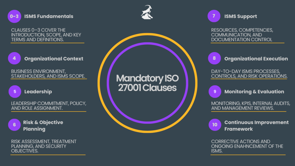 ISO 27001 clauses 4–10 set out how to build, operate, monitor, and improve an Information Security Management System (ISMS). They require specific documented information and records that show intent, implementation, and evidence. Getting these elements right early accelerates certification, reduces rework, and anchors security to business objectives.